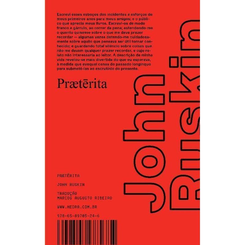 John Ruskin (1819-1900), foi um dos mais importantes intelectuais da era vitoriana. Principal teórico da preservação arquitetônica e ambiental da Inglaterra do século XIX e crítico perspicaz das transformações sociais trazidas ao país pela industrialização, a qual veementemente combateu. Excêntrico, vinculado ao romantismo, grande esteta, valorizava a sensibilidade subjetiva em contraponto à razão; contraditório — ao mesmo tempo aristocrático, reacionário e simpático ao socialismo. “Præterita”, sua autobiografia, foi sua última obra e testamento literário. Escrita ao longo de 27 anos, a desigualdade de suas partes reflete o estado mental do autor durante o período de sua elaboração. O livro, heterodoxo como gênero e de caráter “experimental”, não segue os modelos de autobiografias então vigentes — geralmente apresentados em termos de confissão religiosa —, e poderia também ser considerado como narrativa de viagem, elegia, memória filial ou coleção de excertos de diários. Esta tradução contempla apenas o primeiro dos três volumes de “Præterita”.
