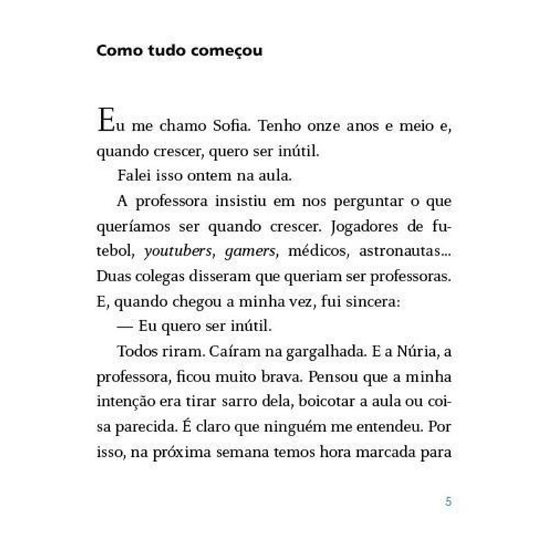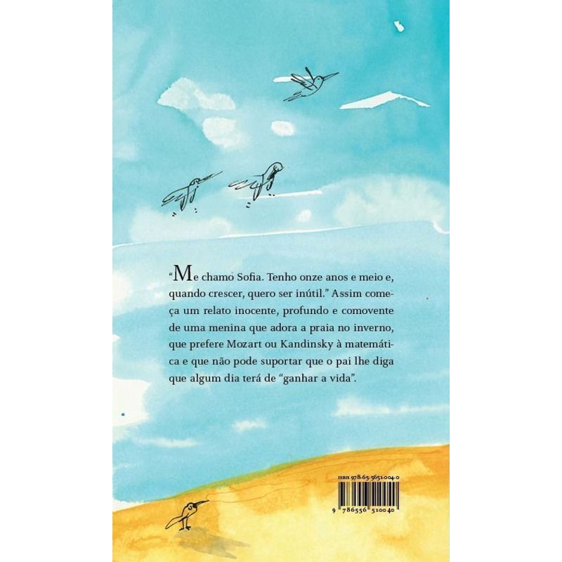 “Me chamo Sofia. Tenho onze anos e meio e, quando crescer, quero ser inútil.” Assim começa um relato inocente, profundo e comovente de uma menina que adora a praia no inverno, que prefere Mozart ou Kandinsky à matemática e que não pode suportar que o pai lhe diga que algum dia tera´ de “ganhar a vida”.