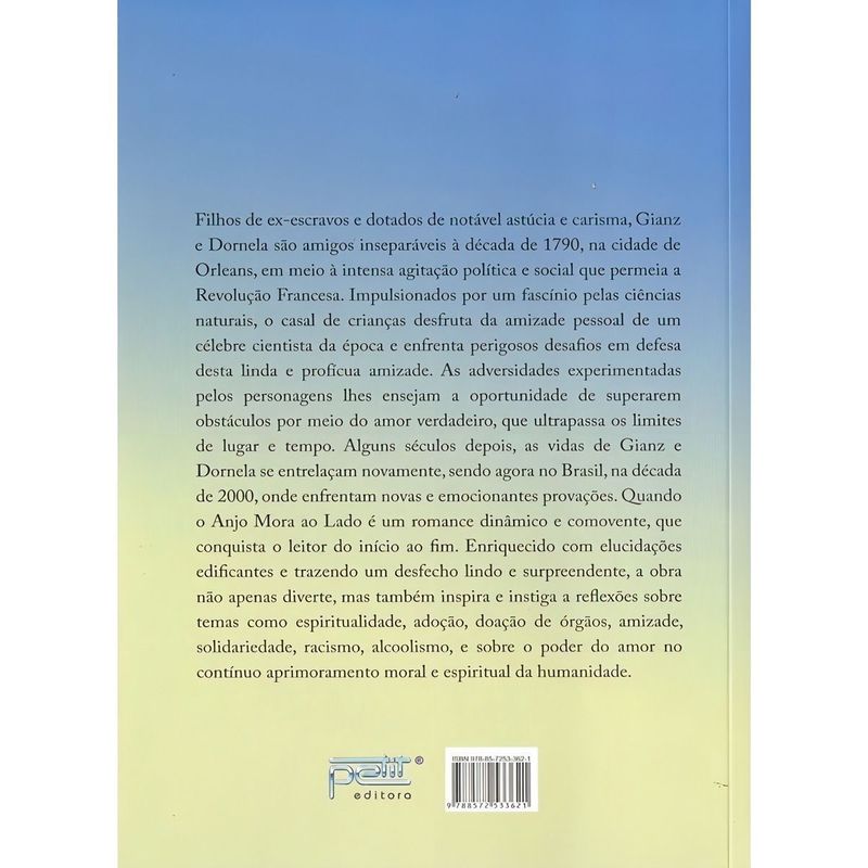 Filhos de ex-escravos e dotados de notável astúcia e carisma, Gianz e Dornela são amigos inseparáveis à década de 1790, na cidade de Orleans, em meio à intensa agitação política e social que permeia a Revolução Francesa. Impulsionados por um fascínio pelas ciências naturais, o casal de crianças desfruta da amizade pessoal de um célebre cientista da época e enfrenta perigosos desafios em defesa desta linda e profícua amizade. As adversidades experimentadas pelos personagens lhes ensejam a oportunidade de superarem obstáculos por meio do amor verdadeiro, que ultrapassa os limites de lugar e tempo. Alguns séculos depois, as vidas de Gianz e Dornela se entrelaçam novamente, sendo agora no Brasil, na década de 2000, onde enfrentam novas e emocionantes provações. Quando o Anjo Mora ao Lado é um romance dinâmico e comovente, que conquista o leitor do início ao fim. Enriquecido com elucidações edificantes e trazendo um desfecho lindo e surpreendente, a obra não apenas diverte, mas também inspira e instiga a reflexões sobre temas como espiritualidade, adoção, doação de órgãos, amizade, solidariedade, racismo, alcoolismo, e sobre o poder do amor no contínuo aprimoramento moral e espiritual da humanidade.