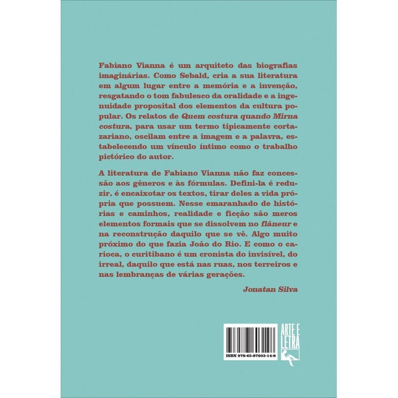 “Fabiano Vianna é um arquiteto das biografias imaginárias. Como Sebald, cria a sua literatura em algum lugar entre a memória e a invenção, resgatando o tom fabulesco da oralidade e a ingenuidade proposital dos elementos da cultura popular. Os relatos de Quem costura quando Mirna costura, para usar um termo tipicamente cortazariano, oscilam entre a imagem e a palavra, estabelecendo um vínculo íntimo como o trabalho pictórico do autor”. Jonatan Silva