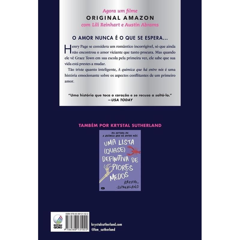 O livro que deu origem ao filme Chemical Hearts, da Amazon Studios, estrelado por Lili Reinhart (Riverdale) e Austin Abrams (Euphoria). Fãs de John Green e Rainbow Rowell vão se apaixonar por esta nada clichê história de amor. Grace Town é diferente. Com suas roupas masculinas, desleixo aparente e uma bengala que leva para todo canto, ela é extremamente reservada, faz perguntas inusitadas e simplesmente não se encaixa em sua nova escola – não que isso seja um problema para ela. Henry Page, por outro lado, é tão comum que chega a ser tedioso e, por motivos que nem ele sabe explicar, se vê cada vez mais atraído pela misteriosa garota. Uma história de primeiros amores com um desfecho surpreendente, A química que há entre nós é um YA tão interessante quanto atípico, e já conquistou os mais diversos tipos de leitores.