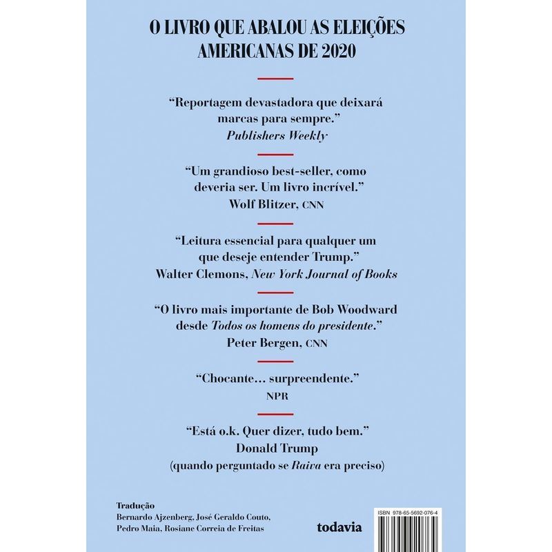 Neste livro, o leitor conhecerá o momento exato em que Trump foi avisado da ameaça representada pela Covid-19. Ao longo de sete meses, Woodward gravou dezessete entrevistas com o então presidente — num raro e detalhado vislumbre de sua mente. O jornalista mostra como membros do gabinete tentavam manter o país a salvo enquanto Trump desmantelava qualquer tentativa de decisão colegiada nos assuntos de segurança nacional.
