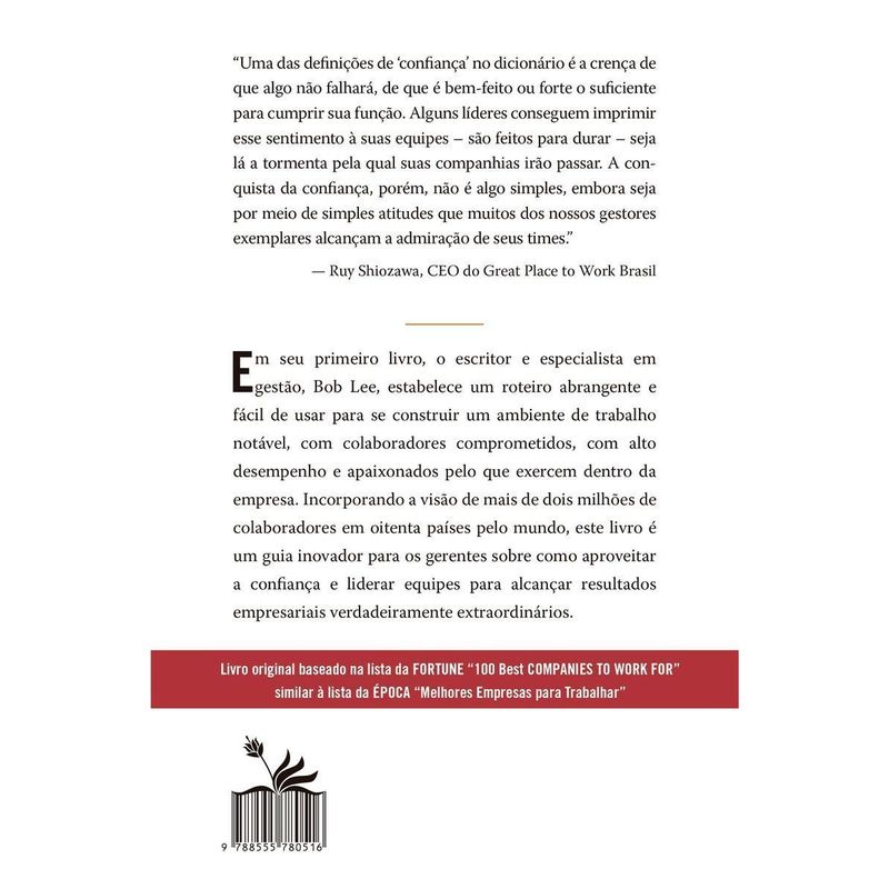 Em seu primeiro livro, o escritor e especialista em gestão, Bob Lee, estabelece um roteiro abrangente e fácil de usar para se construir um ambiente de trabalho notável, com colaboradores comprometidos, com alto desempenho e apaixonados pelo que exercem dentro da empresa. Incorporando a visão de mais de dois milhões de colaboradores em oitenta países pelo mundo, este livro é um guia inovador para os gerentes sobre como aproveitar a confiança e liderar equipes para alcançar resultados empresariais verdadeiramente extraordinários.