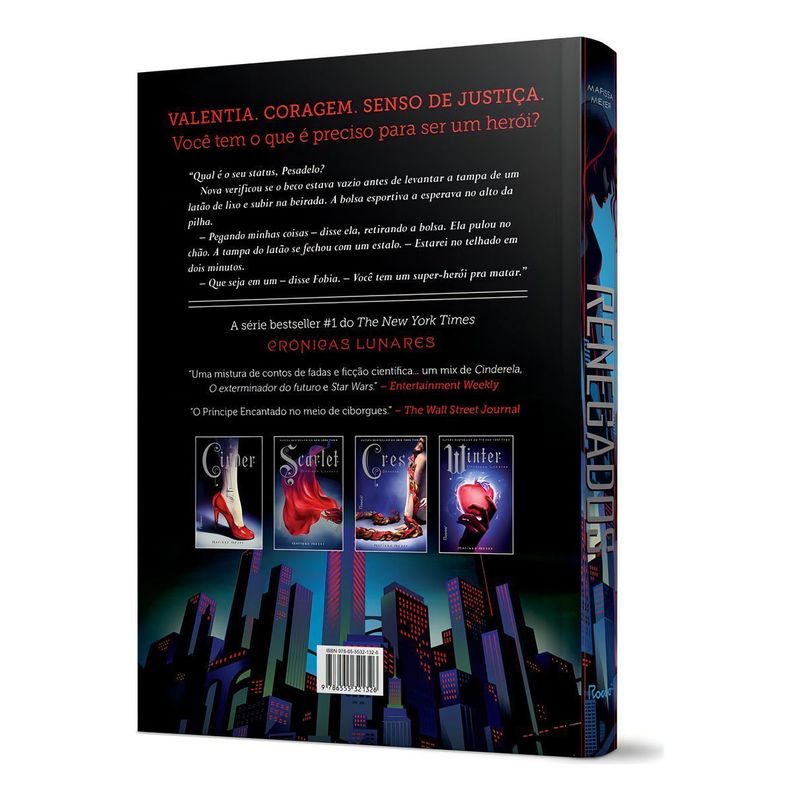 Os Renegados são um grupo de prodígios – humanos com habilidades extraordinárias – que emergiram das ruínas de uma sociedade colapsada. Foram eles que estabeleceram a paz onde, antes, o caos reinava. Eles continuaram sendo um símbolo de esperança e coragem para todos… exceto para os vilões que foram derrotados por eles. Nova, que faz parte do grupo dos Anarquistas, tem um motivo para odiar os Renegados, e está em uma missão em busca de vingança. Enquanto se aproxima de seu alvo, ela conhece Adrian, um garoto Renegado que acredita na justiça – e em Nova. Mas a lealdade de Nova está com os Anarquistas e há um vilão que tem o poder de acabar com os dois, e em tudo que acreditam. Renegados é a nova história de Marissa Meyer, autora bestseller #1 do New York Times da série Crônicas Lunares, que explora um mundo arriscado de aventura, paixão, perigos e traições.