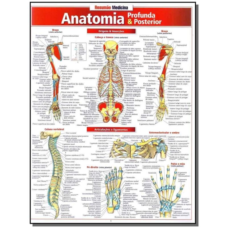 ‘Resumão Anatomia Profunda & Posterior’ é uma poderosa ferramenta educacional para ser usada durante as aulas, nos trabalhos de casa e para repassar a matéria antes das provas e exames. Nele você encontrará: Origens e inserções; Articulações e ligamentos; Músculos profundos; Cérebro; Inervações cutâneas: distribuição de dermátomos e nervos periféricos.