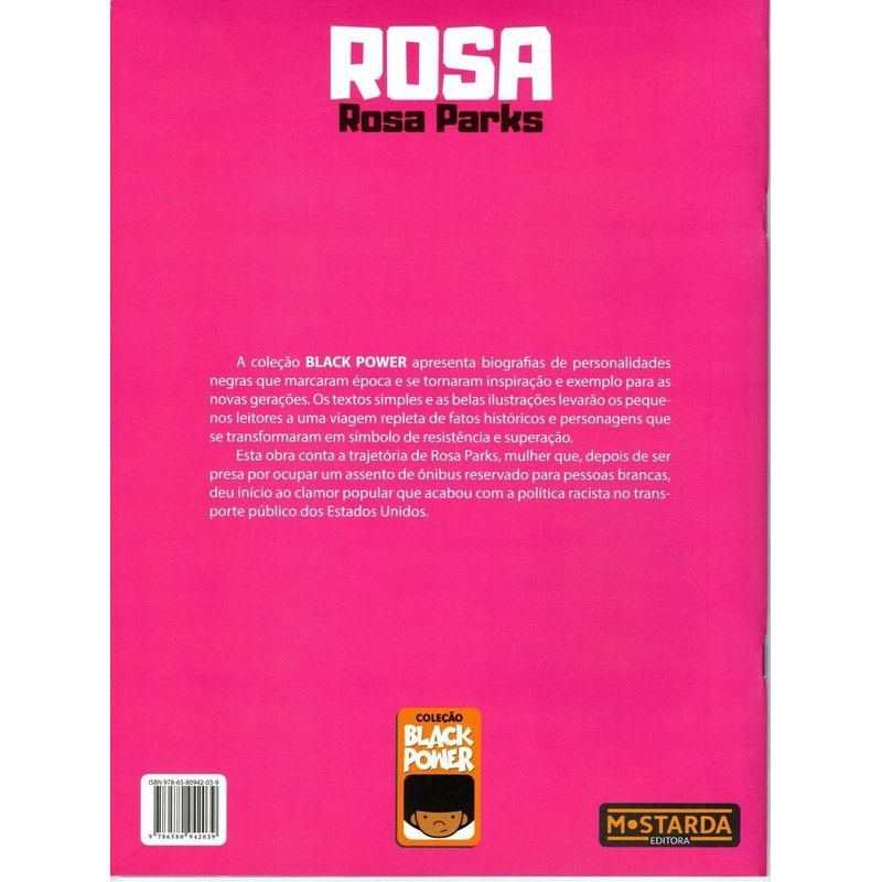 Esta obra conta a trajetória de Rosa Parks, mulher que, depois de ser presa por ocupar um assento de ônibus reservado para pessoas brancas, deu início ao clamor popular que acabou com a política racista no transporte público dos Estados Unidos.A coleção BLACK POWER apresenta biografias de personalidades negras que marcaram época e se tornaram inspiração e exemplo para as novas gerações. Os textos simples e as belas ilustrações levarão os pequenos leitores a uma viagem repleta de fatos históricos e personagens que se transformaram em símbolo de resistência e superação.Esse livro é voltado para crianças e adolescentes.A ideia é que elas percebam que podem ter representatividade negra desde a infância.