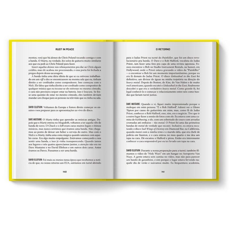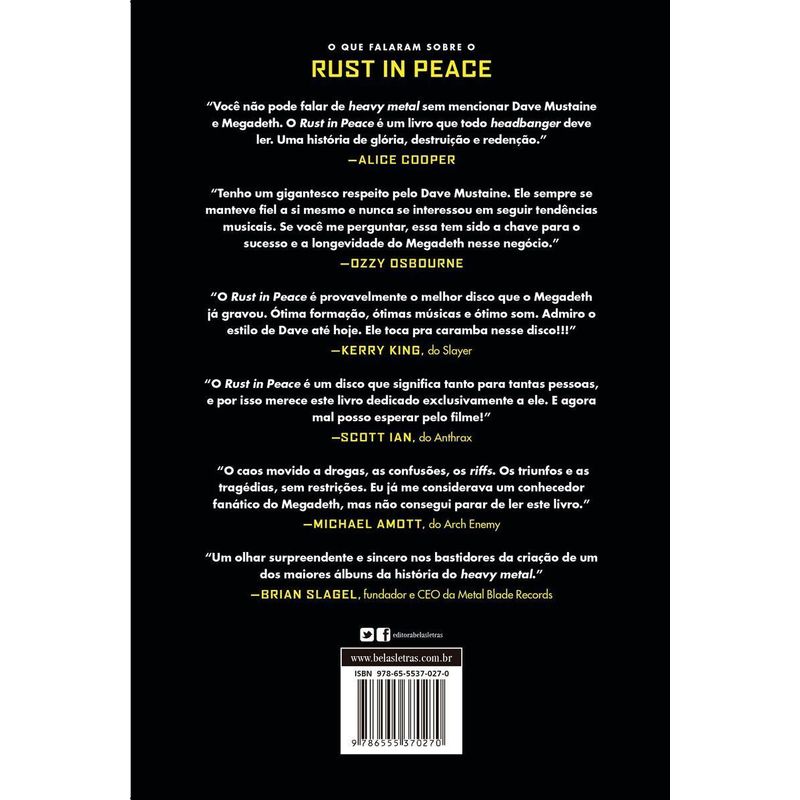 “Você não pode falar de heavy metal sem mencionar Dave Mustaine e Megadeth. Rust in Peace é um livro que todo headbanger deve ler. Uma história de glória, destruição e nção.” ? Alice Cooper “Dave Mustaine sempre se manteve fiel a si mesmo e nunca se interessou em seguir tendências musicais, essa tem sido a chave para o sucesso desse disco do Megadeth.” ? Ozzy Osbourne “Rust in Peace merece esse livro dedicado exclusivamente a ele.” ? Scott Ian A Belas Letras lança no Brasil o novo livro de Dave Mustaine, vocalista e guitarrista do Megadeth e ex-integrante do Metallica. Rust in Peace revela os detalhes da produção do icônico disco do Megadeth, lançado em 1990, durante um período de incrível efervescência e criatividade no mundo do rock. Com a assinatura do próprio vocalista e guitarrista, Dave Mustaine, esse livro relembra o processo de contratação da banda (e da equipe de apoio), além da tentativa de lidar com o sucesso e, por fim, a pressão da fama e da fortuna – o que levou a banda a finalmente se separar. Mustaine mal sabia que as turbulências envolvendo o disco não eram nada comparadas à dor e ao tormento que se aproximavam. Álcool, drogas, sexo, dinheiro, prestígio, mentiras – tudo isso era apenas o começo e, assim como a ferrugem [rust, em inglês] na vida real, esses fatores acabariam corroendo a ligação da banda até que apenas a música sobrevivesse. Rust in Peace é uma história de perseverança, da necessidade de eliminar a ferrugem que se acumula ao longo do tempo em tudo: em nós mesmos, em nossos relacionamentos, na cultura pop, na arte e na música.
