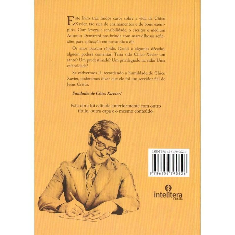 Este livro traz lindos casos sobre a vida de Chico Xavier, tão rica de ensinamentos e de bons exemplos. Com leveza e sensibilidade, o escritor e médium Antonio Demarchi nos brinda com maravilhosas reflexões para aplicação em nosso dia a dia. Os anos passam rápido. Daqui a algumas décadas, alguém poderá comentar: Teria sido Chico Xavier um santo? Um predestinado? Um privilegiado na vida? Uma celebridade? Se estivermos lá, recordando a humildade de Chico Xavier, poderemos dizer que ele foi um servidor fiel de Jesus Cristo. Saudades de Chico Xavier!.