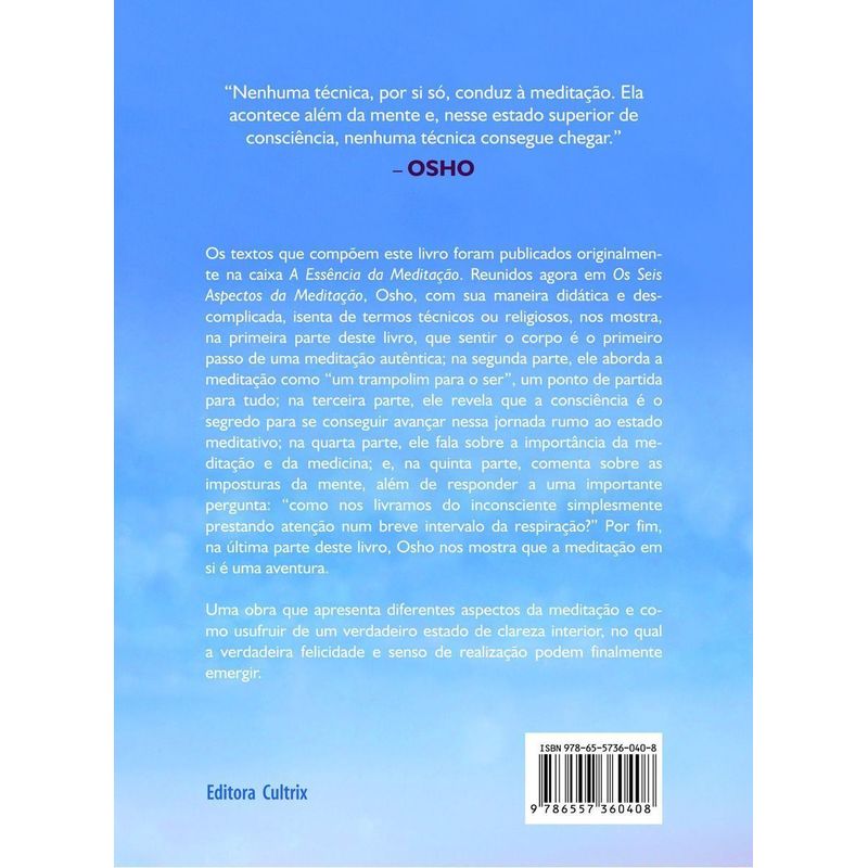 Esta nova edição traz os textos que originalmente faziam parte da caixa A Essência da Meditação. Dividido em quatro partes, Osho aborda, de maneira prática e com liguaguem acessível, os principais pontos para meditar com sucesso, de maneira que se possa alçar a plenitute e a paz interna. Na primeira parte, ele mostra que sentir o corpo é o primeiro passo de uma meditação autêntica. Já na segunda, Osho aborda a meditação como um “trampolim para o ser”. Na terceira parte revela que a consciência é o segredo para conseguir avançar nessa jornada, Já na última parte, apresenta a meditação como uma aventura em si.