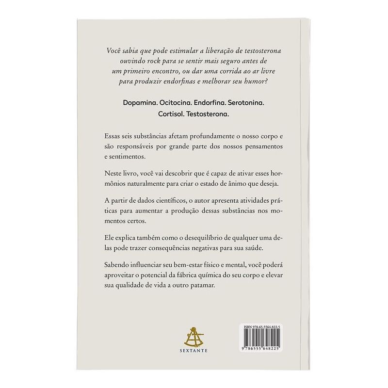 Você sabia que pode estimular a liberação de testosterona ouvindo rock para se sentir mais seguro antes de um primeiro encontro? Ou dar uma corrida ao ar livre para produzir endorfinas e melhorar seu humor Dopamina. Ocitocina. Endorfina. Serotonina. Cortisol. Testosterona. Essas seis substâncias afetam profundamente o nosso corpo e são responsáveis por grande parte dos nossos pensamentos e sentimentos. Neste livro, você vai descobrir que é capaz de ativar esses hormônios naturalmente para criar o estado de ânimo que deseja. A partir de dados científicos, o autor apresenta atividades práticas para aumentar a produção dessas substâncias nos momentos certos. Ele explica também como o desequilíbrio de qualquer uma delas pode trazer consequências negativas para sua saúde. Sabendo influenciar seu bem-estar físico e mental, você poderá aproveitar o potencial da fábrica química do seu corpo e elevar sua qualidade de vida a outro patamar.