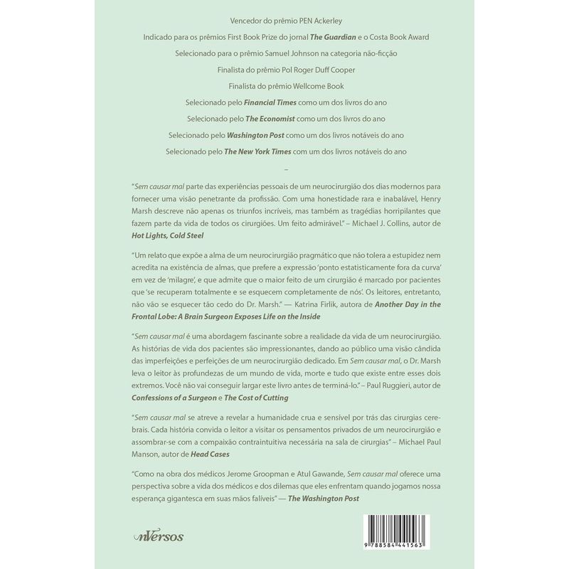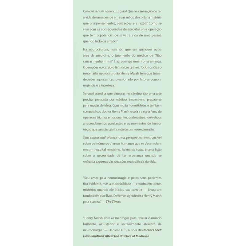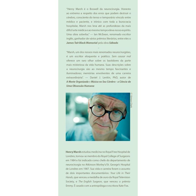 Como é ser um neurocirurgião? Qual a sensação de ter a vida de outra pessoa em suas mãos, de fazer incisões no órgão que cria nossos pensamentos e sentimentos, nossa razão? Como viver com as consequências de uma cirurgia malsucedida que poderia salvar uma vida? São essas e outras indagações que conduzem a obra. Um relato forte e brutalmente honesto de Henry Marsh, experiente profissional inglês que diariamente toma decisões angustiantes sob uma atmosfera de total urgência e incerteza. Com compaixão e candura impressionantes, Dr. Marsh revela sua felicidade ardente em operar, os triunfos comoventes, os devastadores desastres, os arrependimentos amargos e momentos de humor negro que caracterizam a vida de um neurocirurgião. Sem Causar Mal fornece um vislumbre inesquecível sobre os incontáveis dramas humanos que nascem de modernos e movimentados hospitais. Acima de tudo, é uma lição na busca por esperança quando se enfrenta as mais duras decisões da vida.