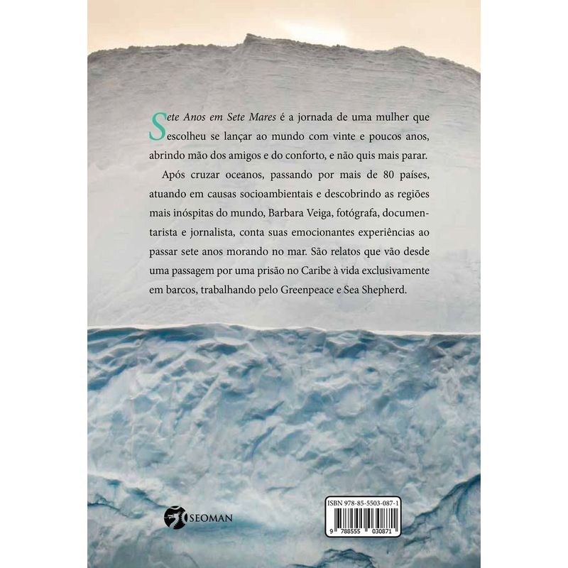 Sete Anos em Sete Mares é a jornada de uma mulher que escolheu se lançar ao mundo com vinte e poucos anos, abrindo mão dos amigos e do conforto, para se entregar a causas que possam ajudar a melhorar o planeta. Após cruzar oceanos, atuar em causas socioambientais em mais de 80 países e visitar as regiões mais inóspitas do mundo, Barbara Veiga, fotógrafa, documentarista e jornalista, conta suas emocionantes experiências ao passar sete anos morando no mar. São relatos sobre a paixão pela vida marinha e seus ensinamentos, aprender a confiar nas pessoas, ser uma mulher em um meio predominantemente masculino, a solidão e saudade de casa, aventuras em meio a piratas e prisões no Caribe, mas, acima de tudo, sobre uma vida trabalhando em causas junto ao Greenpeace, Sea Shepherd e Avaaz.