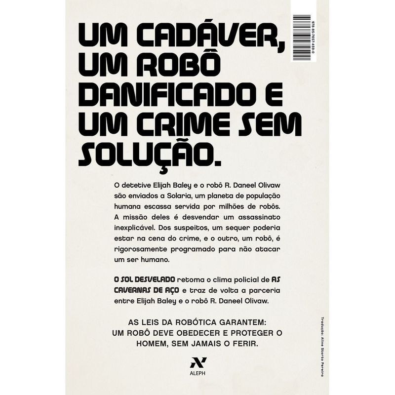 Tendo O Sol Desvelado como segundo volume, a Saga dos Robôs é um dos trabalhos mais notáveis a falar sobre a relação entre o homem e a máquina. Inclusive, dela surgiram as icônicas 3 Leis da Robótica, que tratam de forma ficcional sobre a nossa convivência com os robôs, e ainda hoje é referenciada em diferentes obras da cultura pop. UM HOMEM MORTO, UM ROBÔ DANIFICADO E UM CRIME SEM SOLUÇÃO Convocado para uma reunião em Washington, Elijah Baley descobre que foi escalado para investigar um novo crime. Desta vez, porém, o policial deverá deixar a segurança da Terra e enfrentar sua fobia de espaços abertos. O destino dele é Solaria, um planeta exótico que limita sua população humana a 20 mil habitantes. Vivendo em vastas propriedades individuais atendidas por uma legião de robôs, os solarianos praticamente eliminaram o contato interpessoal, limitando-o a projeções holográficas. Ainda assim, um brutal assassinato acontece, e a vítima é um dos cidadãos mais ilustres do planeta. Ao lado do corpo, um robô foi encontrado. Com a ajuda do ex-parceiro robótico R. Daneel Olivaw, Baley juntará as peças do quebra-cabeça para decifrar esse caso complicado, em que os dois únicos suspeitos do crime simplesmente não poderiam tê-lo cometido. Em O SOL DESVELADO, Asimov retoma o universo criado em AS CAVERNAS DE AÇO e delineia os diferentes mundos siderais que acabariam influenciando as continuações de sua obra mais importante: A TRILOGIA DA FUNDAÇÃO – AS TRÊS LEIS DA ROBÓTICA GARANTEM: UM ROBÔ DEVE OBEDECER E PROTEGER O SER HUMANO, SEM JAMAIS O FERIR. SERÁ?
