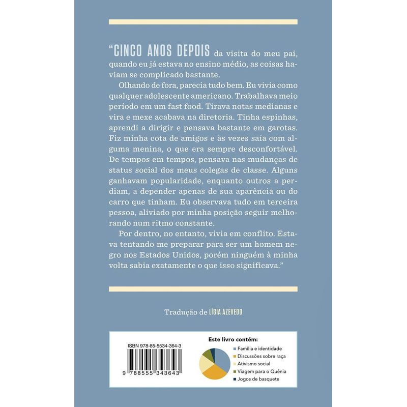 A jornada envolvente de Barack Obama em busca da própria identidade, agora em edição adaptada para jovens. Neste seu primeiro livro de memórias, publicado originalmente em 1995 — muito antes de se tornar presidente e uma das vozes mais potentes dos Estados Unidos —, Barack Obama conduz o leitor por sua infância e juventude. Filho de uma estadunidense branca e de um queniano negro, Obama carrega uma herança familiar dividida. Suas primeiras indagações sobre raça e classe começaram ainda no ensino médio. Depois, trabalhou como líder comunitário até ser aceito em Harvard. Antes de começar as aulas de direito, porém, percebe que chegou o momento de viajar ao Quênia e visitar o outro lado da família: a do pai que mal conheceu. Enquanto investiga a fundo sua história e legado familiar, Obama levanta uma série de questionamentos sobre identidade e pertencimento e aprende a fazer as pazes com suas origens. Sonhos do meu pai é uma reflexão poderosa sobre o que significa ser negro nos Estados Unidos. A obra foi eleita um dos melhores livros de não ficção de todos os tempos pelo Guardian e pela Time.