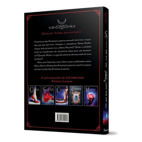 “Além do “felizes para sempre”. O universo das Crônicas Lunares esconde histórias e segredos que são incríveis, viciantes e românticos. Como Cinder chegou pela primeira vez a Nova Pequim? Como o soldado Lobo se transformou de um jovem rapaz para um assassino? Quando Winter e o guarda Jacin se deram conta de seus destinos? Com nove histórias, cinco delas nunca publicadas antes, Stars Above: Contos das Crônicas Lunares é um livro essencial para os fãs das Crônicas Lunares. O encantamento continua… A guardiã – Como a princesa Selene foi parar na Terra e aos cuidados de Michelle Benoit. Falhas – Cinder chega à sua nova casa e encontra sua nova família. Aqui, ela descobre suas habilidades como mecânica e faz uma amiga muito importante. O exército da rainha – O exército da rainha Levana está sendo formado e conta com um soldado em particular que está disposto a fazer tudo para não se tornar o monstro que querem que ele seja. Guia de Carswell para ser uma pessoa de sorte – O jovem Carswell Thorne tem grandes planos, que envolvem uma nave Rampion e uma viagem só de ida para Los Angeles. Depois que o sol passar – A pequena Cress, de apenas oito anos, acaba sendo jogada em um satélite, completamente sozinha e tendo que espionar a Terra para Luna. A princesa e o guarda – Winter e seu amigo de infância Jacin começam um jogo onde uma princesa precisa ser salva. A pequena androide – Um conto inspirado em “A pequena sereia” que se passa no universo de Crônicas Lunares. O mecânico – O primeiro encontro de Kai e Cinder, pelo ponto de vista do futuro imperador. Algo velho, algo novo – Nesse epílogo de Winter, todos os seus amigos se reúnem para fazer o casamento do século acontecer.”