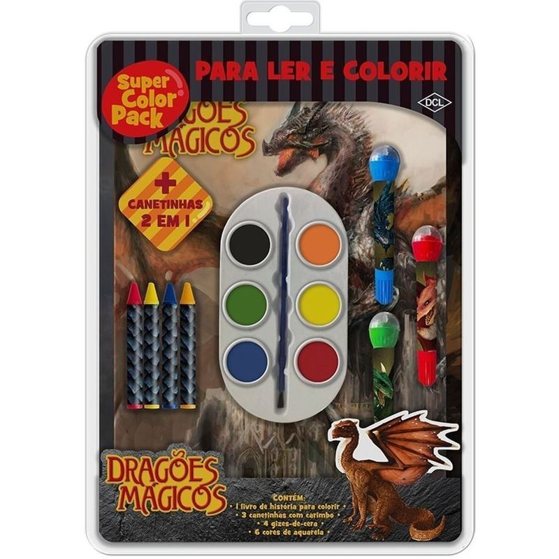 Brinque e se diveirta com os Dragões Mágicos. Este blíster inclui livro para ler e colorir, gizes de cera, paleta de aquarela e canetinhas com carimbos acoplados.