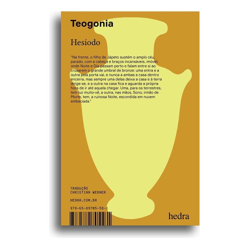 “Teogonia” (em grego “theogonia”, “theos” = deus + “genea” = origem) é um poema de 1022 versos hexâmetros datílicos que descreve a origem e a genealogia dos deuses. Muito do que sabemos sobre os antigos mitos gregos é graças a esse poema que, pela narração em primeira pessoa do próprio poeta, sistematiza e organiza as histórias da criação do mundo e do nascimento dos deuses, com ênfase especial a Zeus e às suas façanhas até chegar ao poder. A invocação das Musas, filhas da Memória, pelo aedo Hesíodo é o que lhe dá o conhecimento das coisas passadas e presentes e a possibilidade de cantar em celebração da imortalidade dos deuses; e é a partir daí que são narradas as peripécias que constituem o surgimento do universo e de seus deuses primordiais.