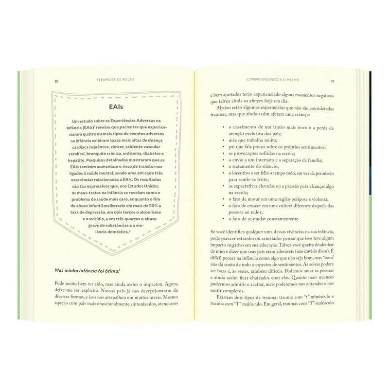 Terapeuta britânica cria manual de bolso com ferramentas para enfrentar traumas do passado e transformar sua vida no presente Todos os dias, a psicoterapeuta Annie Zimmerman atende pacientes que estão enfrentando verdadeiras batalhas pessoais. Eles estão dispostos a mudar, mas continuam presos ao estágio das perguntas. Eles se questionam: por que permaneço em um relacionamento ruim? Por que perco a paciência? O que há de errado comigo? Não há nada errado. Só as perguntas que estão fazendo. Depois de anos ouvindo esses questionamentos na prática clínica, Zimmerman decidiu compartilhar os conhecimentos e as técnicas que utiliza em seu consultório. A autora detalha conceitos complexos de forma didática e oferece exercícios simples, mostrando que, se compreendermos como o início da vida molda nossas atitudes quando adultos, podemos começar a fazer as perguntas certas para mudar nossos padrões de comportamento. Com este guia, você se sentirá mais confiante e terá ao seu alcance as ferramentas de que precisa para encontrar mais propósito, resiliência e alegria no dia a dia. Quer você lide com conflitos em seus relacionamentos, negatividade, ansiedade, depressão ou outro problema emocional, Terapeuta de bolso o capacitará a mergulhar em seu passado para começar a resolver seus problemas do presente.