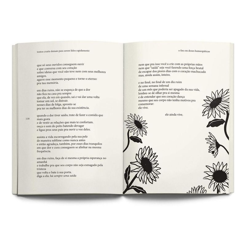 Após o sucesso absoluto dos dois volumes de Textos cruéis demais para serem lidos rapidamente, Igor Pires retorna em mais uma coletânea inédita de textos poéticos, desta vez sobre as características das complexas fases que percorrem os relacionamentos. Dividido em quatro partes, O fim em doses homeopáticas explora de modo sensível o inevitável fim. O livro conta ainda com as belas ilustrações de Anália Moraes (Casa Dobra).
