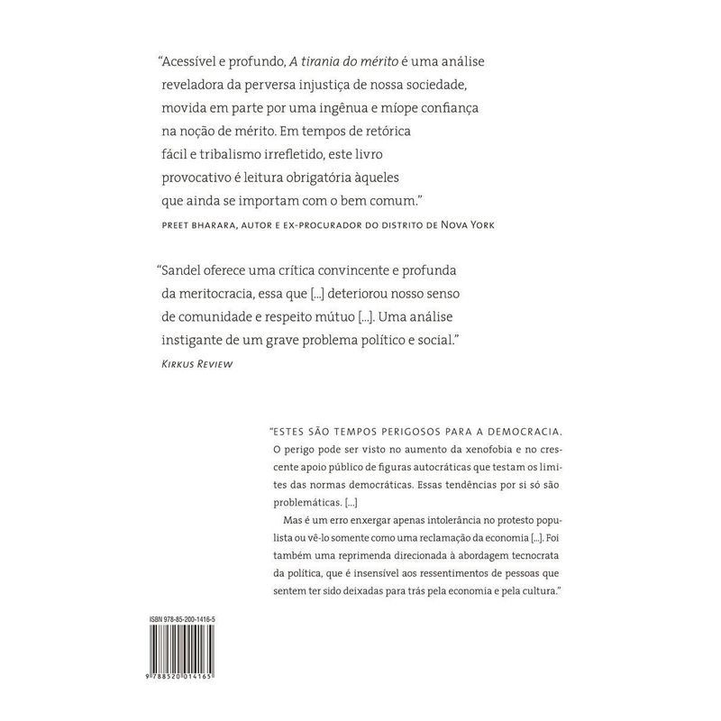 As democracias liberais estão em risco. E, de acordo com o filósofo Michael J. Sandel, o princípio do mérito, um de seus pilares básicos, é o responsável por esse cenário. Vivemos em uma constante competição, que separa o mundo entre “ganhadores” e “perdedores”, esconde privilégios e vantagens e justifica o status quo por meio de ideias como “quem se esforça tudo pode” e “se você pode sonhar, você pode fazer”. O resultado concreto é um mundo que reforça a desigualdade social e, ao mesmo tempo, culpabiliza as pessoas, o que gera uma onda coletiva de raiva, frustração, populismo, polarização e descrença em relação ao governo e aos demais cidadãos. A resposta pública se manifesta em eventos como as eleições de Donald Trump, nos Estados Unidos em 2016, e de Jair Bolsonaro, no Brasil em 2018. Ao analisar conceitos em torno da ética do estudo, do trabalho, do sucesso, do fracasso, da tentativa e de quais são os meios considerados legítimos para trilhar esses caminhos, Sandel sugere um novo olhar para essas relações. O autor salienta as contradições do discurso meritocrático, seus contextos estruturais e a arrogância dos “vencedores”, que julgam duramente os “perdedores”. A tirania do mérito propõe que para existir uma ética diferente e dignificadora, o sucesso deve ser compreendido em prol da coletividade. Indica que uma alternativa de pensamento guiado pela humildade, pela compreensão do papel do acaso na vida humana e pela criação real da oportunidade poderá ser, então, a melhor bússola para a democracia, para o bem comum.