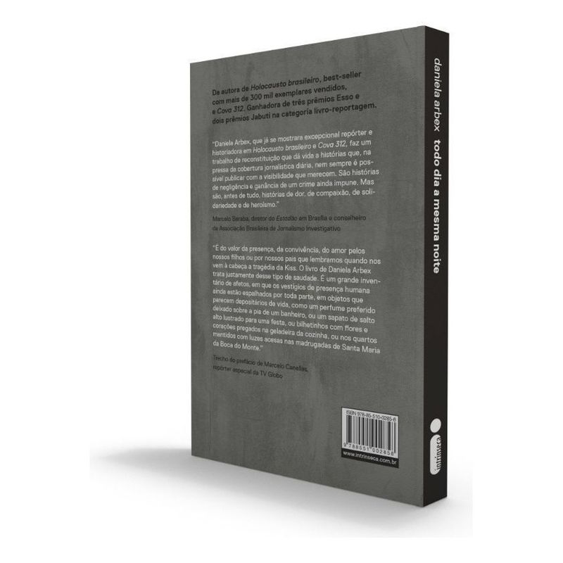 Reportagem definitiva sobre a tragédia que abateu a cidade de Santa Maria em 2013 relembra e homenageia os 242 mortos no incêndio da Boate Kiss. Daniela Arbex reafirma seu lugar como uma das jornalistas mais relevantes do país – premiada por duas vezes com o prêmio Jabuti – ao reconstituir de maneira sensível e inédita os eventos da madrugada de 27 de janeiro de 2013. Foram necessárias centenas de horas dos depoimentos de sobreviventes, familiares das vítimas, equipes de resgate e profissionais da área da saúde – ouvidos pela primeira vez neste livro -, para sentir e entender a verdadeira dimensão de uma tragédia sobre a qual já se pensava saber quase tudo. A leitura de Todo dia a mesma noite é uma dolorosa e necessária tomada de consciência, um despertar de empatia pelos jovens que tiveram seus futuros barbaramente arrancados. Enxergá-los vividamente no livro é um exercício que afasta qualquer apaziguamento que possamos sentir em relação ao crime, ainda impune.