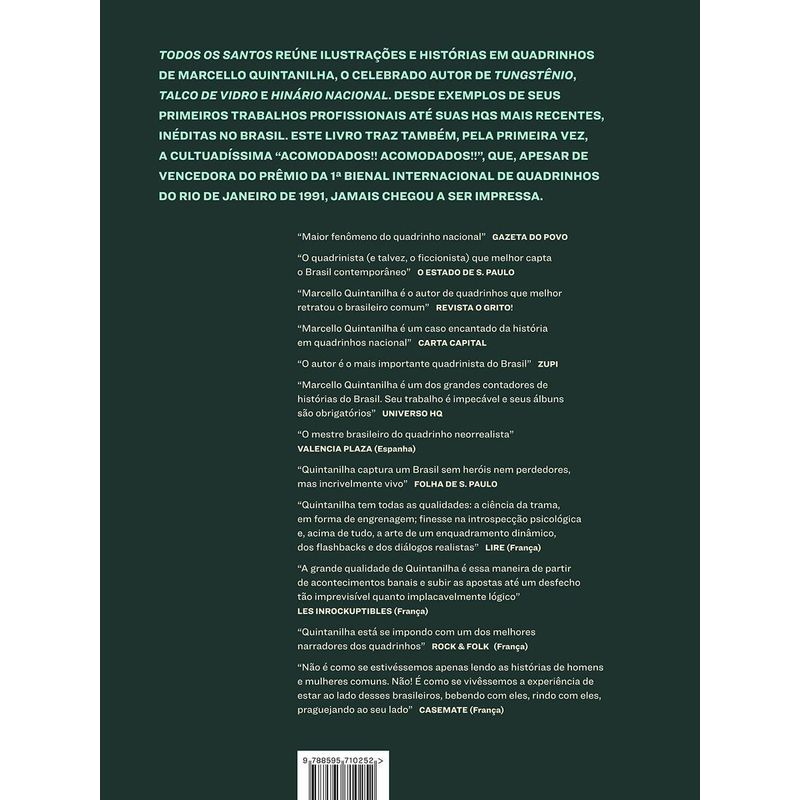 Todos os Santos reúne ilustrações e histórias em quadrinhos de Marcello Quintanilha, o celebrado autor de Tungstênio, Talco de Vidro e Hinário Nacional. Desde exemplos de seus primeiros trabalhos profissionais até suas HQs mais recentes, inéditas no Brasil. Este livro traz também, pela primeira vez, a cultuadíssima “Acomodados. Acomodados. ”, que, apesar de vencedora do prêmio da 1ª Bienal Internacional do Rio de Janeiro de 1991, jamais chegou a ser impressa.