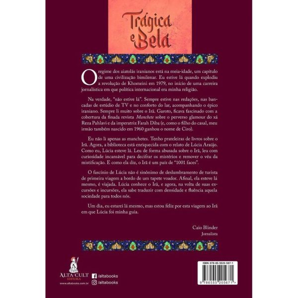 O regime dos aiatolás iranianos está na meia-idade, um capítulo de uma civilização bimilenar. Eu estive lá quando explodiu a revolução de Khomeini em 1979, no início de uma carreira jornalística em que política internacional era minha religião. Na verdade, “não estive lá”. Sempre estive nas redações, nas bancadas de estúdio de TV e no conforto do lar, acompanhando o épico iraniano. Sempre li muito sobre o Irã. Garoto, ficava fascinado com a cobertura da finada revista Manchete sobre o perverso glamour do xá Reza Pahlavi e da imperatriz Farah Diba (e, como o filho do casal, meu irmão também nascido em 1960 ganhou o nome de Ciro). Eu não li apenas as manchetes. Tenho prateleiras de livros sobre o Irã. Agora, a biblioteca está enriquecida com o relato de Lúcia Araújo. Como eu, Lúcia esteve lá. Leu de forma abusada sobre o Irã, leu com curiosidade incansável para decifrar os mistérios e remover o véu da mistificação. E como ela diz, o Irã é um país de “1001 faces”. O fascínio de Lúcia não é sinônimo de deslumbramento de turista de primeira viagem a bordo de um tapete voador. Afinal, ela esteve lá mesmo, é viajada. Lúcia conhece o Irã, e agora, na volta de suas excursões e incursões, ela sabe traduzir com densidade e fluência aquela sociedade para todos nós. Um dia, eu estarei lá mesmo, mas estou feliz por esta viagem ao Irã em que Lúcia foi minha guia. — Caio Blinder, Jornalista