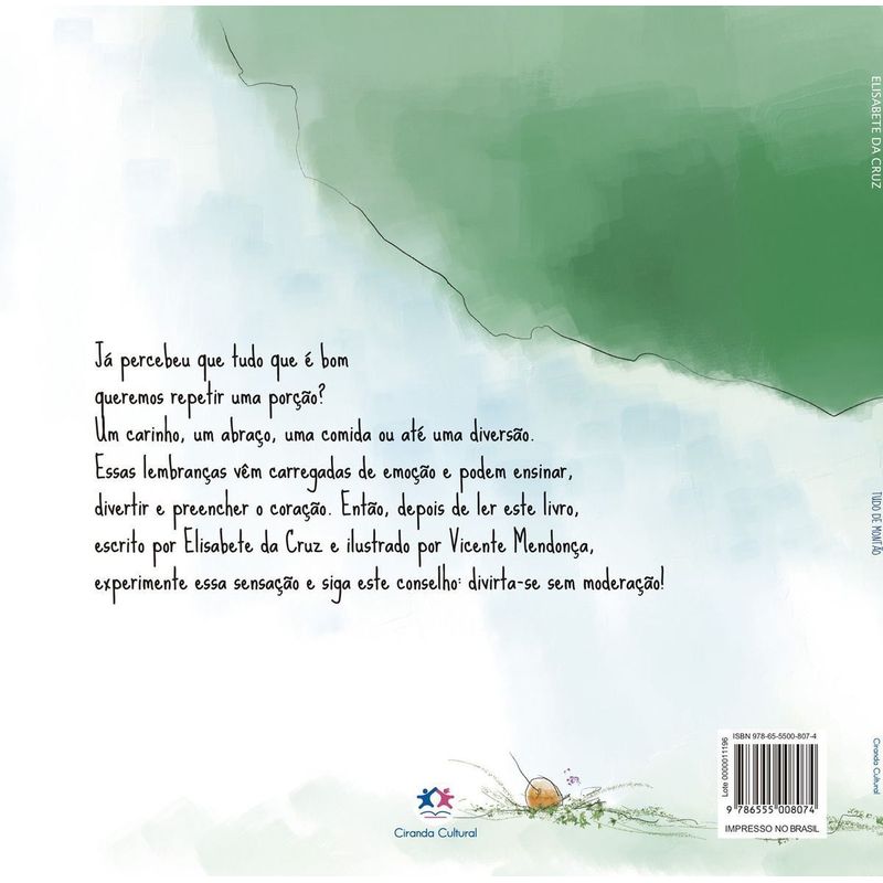 Já percebeu que tudo que é bom queremos repetir uma porção? Um carinho, um abraço, uma comida ou até uma diversão. Essas lembranças vêm carregadas de emoção e podem ensinar, divertir ou preencher o coração. Então, depois de ler este livro, escrito por Elisabete da Cruz e ilustrado por Vicente Mendonça, experimente essa sensação e siga este conselho: divirta-se sem moderação!