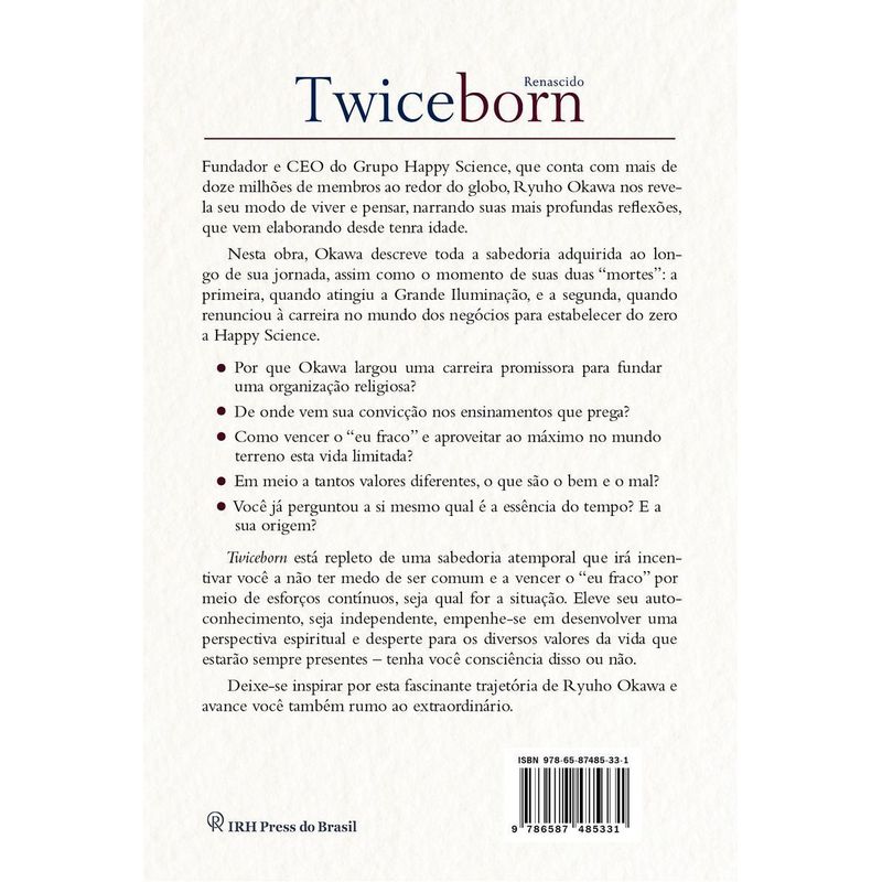 Twiceborn introduz aos anos de formação de Ryuho Okawa que levaram à revelação de sua atual missão sagrada. É mais do que um livro de autobiografia e autoajuda; é um guia para os leitores descobrirem seus verdadeiros chamados da vida. Ao longo do livro, Okawa explora as várias lições de vida aprendidas ainda em sua tenra idade, e da mesma forma, revela ao leitor como conseguir sublimar suas próprias experiências em lições que auxiliam no desenvolvimento pessoal.