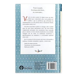 Este devocional diário ajudará os cônjuges a dar e receber amor de uma forma inteiramente nova. Por meio deestes comprovados princípios, eles encontrarão força renovada para se unirem a Cristo a fim de atenderem às necessidades conjugais um do outro.As meditações incentivam o aperfeiçoamento do casamento e o crescimento espiritual como casal.São 52 semanas de devocionais com temas relacionados a confiança, bondade, intimidade, respeito…e muito mais
