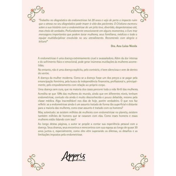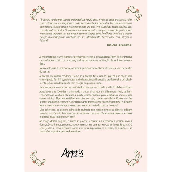 A endometriose é uma doença extremamente cruel e avassaladora. Além da dor intensa e do sofrimento físico e emocional, pode gerar inúmeras mutilações às mulheres acometidas. No entanto, não é uma doença explícita, pelo contrário, é bem silenciosa e vem de dentro do ventre. A doença da mulher moderna. Como se a doença fosse um dos preços a se pagar pela emancipação feminina, pela busca da independência financeira, profissional e, principalmente, pelo empoderamento com relação ao próprio corpo. Uma doença sem cura, que na maioria dos casos percorre toda a vida fértil das mulheres. Acredita-se que 10% das mulheres do mundo, ainda que em diferentes níveis, tenham endometriose, contudo ela ainda é muito desconhecida e pouco debatida, mesmo pela classe médica. Algo inacreditável nos dias de hoje, porém verdadeiro. O que nos faz refletir: se a endometriose ainda é um assunto tratado de forma tão superficial e distante para a maioria das mulheres, como esse assunto é tratado com os homens? Mas, sobretudo: se existem milhões de mulheres com endometriose no planeta, existem também milhões de homens que se casaram com elas. Como esses homens e essas mulheres estão lidando com isso? Ao longo destas páginas, o autor se propõe a contar sua experiência pessoal com a doença. Seus dramas, seus encontros e reencontros com sua esposa ao longo de quase 30 anos juntos e, especialmente, como eles vêm superando os dilemas, os desafios e as limitações impostos pela endometriose.