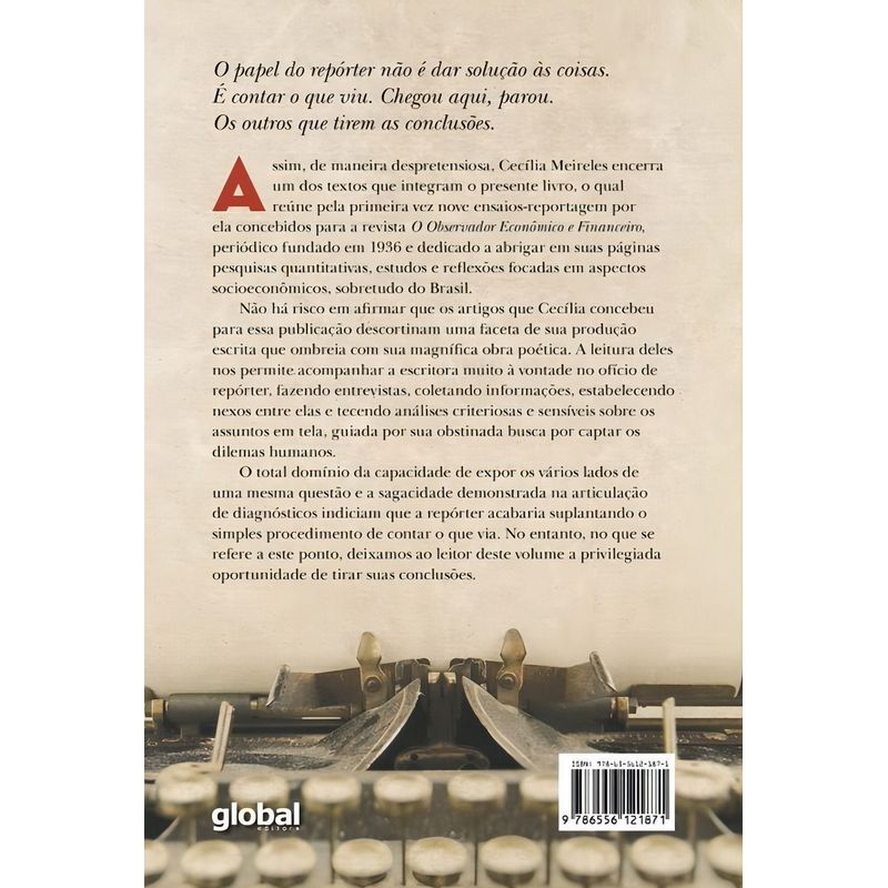 A magnitude da poesia de Cecília Meireles já é bastante celebrada tanto nacional, como internacionalmente. Outro segmento da produção escrita da autora é sua produção no campo dos contos. Suas crônicas, também integram um capítulo modelar de nossa literatura. A presente publicação oferece a oportunidade aos leitores de conhecer um lado de Cecília ainda por ser conhecido. Os nove textos de Cecília Meireles aqui coligidos foram publicados na revista Observador econômico e financeiro entre fevereiro de 1939 e maio de 1940. O que temos nesta edição são ensaios/reportagens concebidos pela escritora nas quais ela toca de forma profunda em questões centrais de sua época como: o cotidiano desafiador do professor (tanto os do magistério como no nível superior), as barreiras para a formação de um sistema de ensino que prepare adequadamente os jovens para a vida profissional, as barreiras enfrentadas pelas mulheres para firmar seu lugar na sociedade brasileira, a importância da moda na vida das pessoas, a necessidade dos trabalhadores terem um período de descanso em benefício de sua saúde, etc. A leitura do conjunto de matérias/reportagens envolve os leitores não apenas em virtude da qualidade textual única, como também os encanta pela capacidade da escritora em abordar os assuntos de maneira muito perspicaz e pessoal, lançadas pela primeira vez em Livro e com apresentação do Doutor em História social pela USP Gustavo Tuna esse Livro é um marco na publicação das obras da Cecília no Brasil.