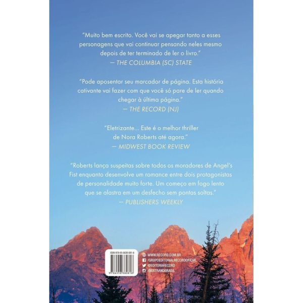 “No romance psicológico Um sinal dos céus, Nora Roberts, autora best-seller do New York Times, explora os confins da cordilheira Teton para nos contar uma história eletrizante de amor, suspense, assassinato e loucura. Sobrevivente de uma experiência traumática em Boston, Reece Gilmore precisou percorrer um longo e árduo caminho até se deparar com a vista deslumbrante que contempla agora. É em Angel’s Fist, Wyoming, que Reece encontra um lar — a princípio temporário — e um emprego como chef em uma lanchonete, enquanto luta desesperadamente contra os pesadelos e os ataques de pânico que a assombram. Tudo corre perfeitamente bem até que, certa manhã, Reece decide fazer uma trilha em uma das montanhas que cercam a cidade. Que lindo, pensou ela, olhando para as águas agitadas do rio Snake pelo binóculo. É então que Reece avista um homem e uma mulher no outro lado da margem do rio. Discutindo. Brigando. E, de repente, o homem está em cima da mulher, as mãos em seu pescoço… Descendo a trilha, um escritor ranzinza e solitário chamado Brody desfruta da paz que é morar sozinho e isolado do mundo. Porém, quando Reece finalmente o alcança e o leva até o local onde estava para lhe mostrar a cena que presenciou, o casal já havia desaparecido. As autoridades vasculham a área do suposto ataque, mas não encontram nada. Nenhum sinal de luta. Nenhum vestígio no solo que indicasse atividades recentes. Nem uma marca de pneu sequer. Além disso, ninguém em Angel’s Fist parece acreditar nela. Afinal, Reece acabou de chegar à cidade e já tinha fama de instável e ansiosa — talvez até um pouco frágil. Quem sabe seja a hora de partir de novo, de seguir em frente… Reece Gilmore tem certeza de que há um assassino em Angel’s Fist, mesmo que Brody, apesar de sua nítida impaciência e pretensão de não investir muito nessa relação, seja a única pessoa na cidade que demonstre acreditar nela. Quando uma série de eventos ameaçadores deixa explícito que alguém quer tirá-la da jogada, Reece precisa depositar toda sua confiança em Brody — e em si mesma — para descobrir se há de fato um assassino em Angel’s Fist, antes que seja tarde demais. “Muito bem escrito. Você vai se apegar tanto a esses personagens que vai continuar pensando neles mesmo depois de ter terminado o livro.” – The Columbia (SC) State “Pode aposentar seu marcador de página. Esta história cativante vai fazer com que você só pare de ler quando chegar à última página.” – The Record (Bergen County, NJ) “Eletrizante… Um sinal dos céus é o melhor thriller de Nora Roberts até agora.” – Midwest Book Review “