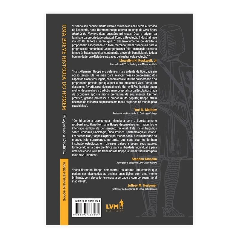 “Usando seu conhecimento vasto e as reflexões da Escola Austríaca de Economia, Hans-Hermann Hoppe aborda ao longo de ‘Uma Breve História do Homem’, duas questões principais: Qual a origem da família e da propriedade privada? Como a Revolução Industrial teve início? Os leitores verão que o desenvolvimento do direito à propriedade assegurado e o livre-mercado foram essenciais para o progresso da humanidade. A pergunta a ser feita em relação ao nosso tempo é: Estes conceitos continuarão a evoluir, beneficiando toda a humanidade, ou o Estado será capaz de frustrar esta evolução?” — Llewellyn H. Rockwell, Jr. (Fundador e CEO do Ludwig von Mises Institute)