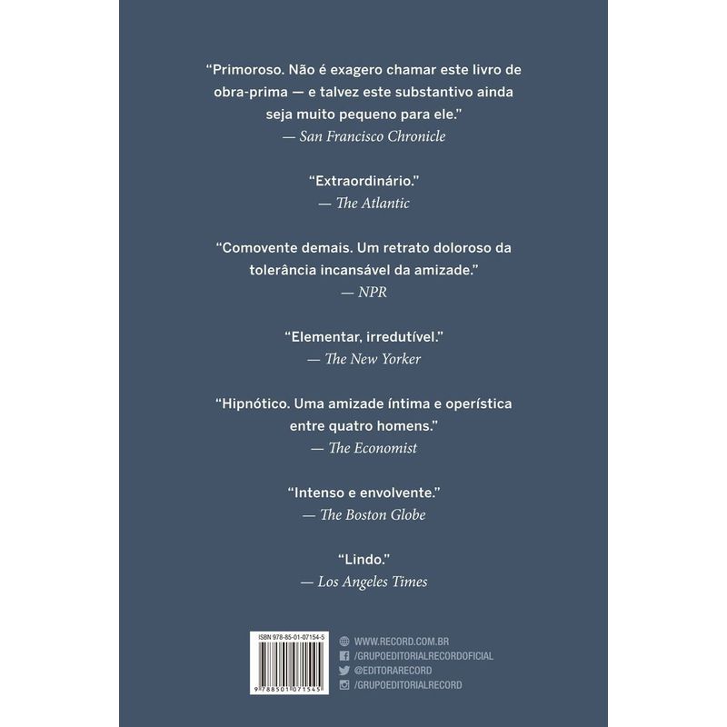 Quando quatro amigos de uma pequena faculdade de Massachusetts se mudam para Nova York em busca de uma vida melhor, eles se veem falidos, sem rumo e amparados apenas por sua amizade e por suas ambições. Com o tempo, o relacionamento deles se aprofunda e se anuvia, matizado pelo vício, pelo sucesso e pelo orgulho. Com uma prosa magnífica e genial, Hanya Yanagihara criou um hino trágico e transcendental do amor fraterno, uma representação magistral da dor física e psicológica, e uma análise da verdade nua e crua que permeia a tirania da memória e os limites da resistência humana.