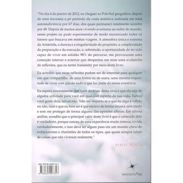 Um depoimento repleto de reflexões e observações que o próprio autor nos mostra neste trecho: “No dia 4 de janeiro de 2012, eu cheguei ao Polo Sul geográfico, depois de uma travessia a pé partindo da costa antártica realizada em total autossuficiência por 67 dias, dos quais permaneci totalmente sozinho por 48. Depois de muitos anos vivendo aventuras ao redor do mundo, nesse projeto eu pude experimentar de modo maximizado todos os fatores que buscava em minhas viagens. A atmosfera única e extrema da Antártida, a dureza e a singularidade do propósito, a complexidade da preparação e da execução, e, sobretudo, a oportunidade de ter sido capaz de viver em solidão 98% do percurso, me provocaram uma comoção interior e exterior que despertou em mim uma avalanche de reflexões, que eu tentei transmitir por meio deste livro. Eu acredito que essas reflexões podem ser de interesse para qualquer um que compartilhe, de uma forma ou de outra, uma mínima inquietude de viver com paixão tudo o que faz parte da nossa existência”.