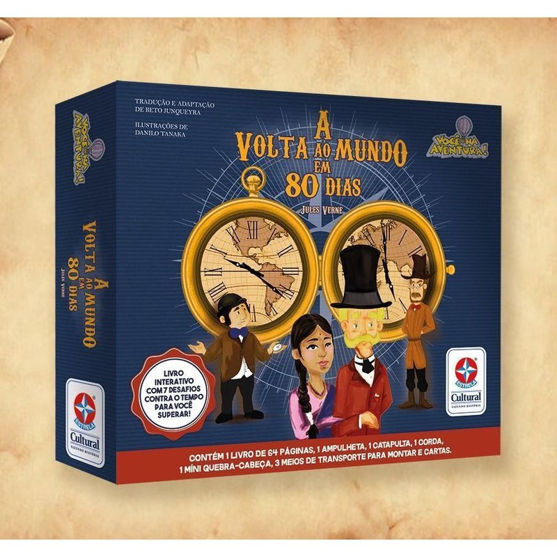 Em 1872, o misterioso Phileas Fogg é desafiado pelos seus colegas a provar que consegue dar a volta ao mundo em oitenta dias. Acompanhado pelo trapalhão Passepartout, ele certamente terá de superar muitos obstáculos ao longo do caminho. Conseguirá realizar tamanha façanha para aqueles tempos? O mais incrível é que você, leitor, será decisivo nesta aventura pelo mundo. Juntos, você, Phileas Fogg e seus companheiros terão de vencer essa batalha contra o tempo. Contém na embalagem: 1 livro, 1 ampulheta, 3 brinquedos para montar, 1 quebra-cabeça, 1 corda, 1 baralho e 1 catapulta.