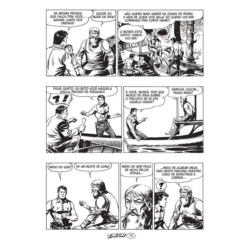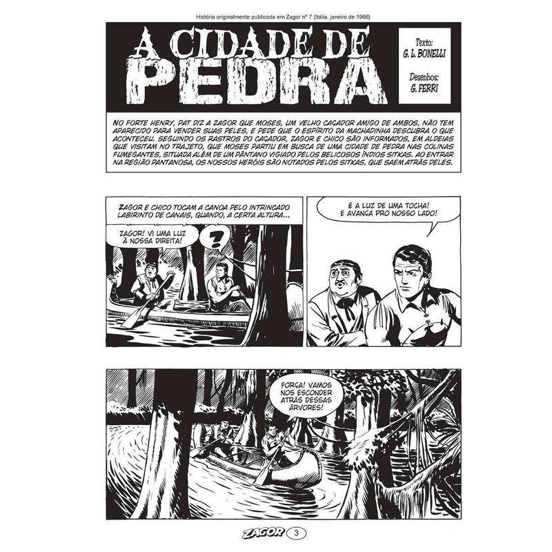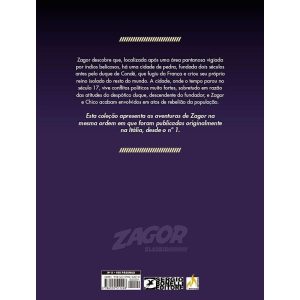 A CIDADE DE PEDRA Zagor descobre que, localizada após uma área pantanosa vigiada por índios belicosos, há uma cidade murada, fundada dois séculos antes pelo duque de Condé, que fugiu da França e criou seu próprio reino isolado do resto do mundo. A cidade, onde o tempo parou no século 17, vive conflitos políticos muito fortes, sobretudo em razão das atitudes do despótico duque, descendente do fundador, e Zagor e Chico acabam envolvidos em atos de rebelião da população.
