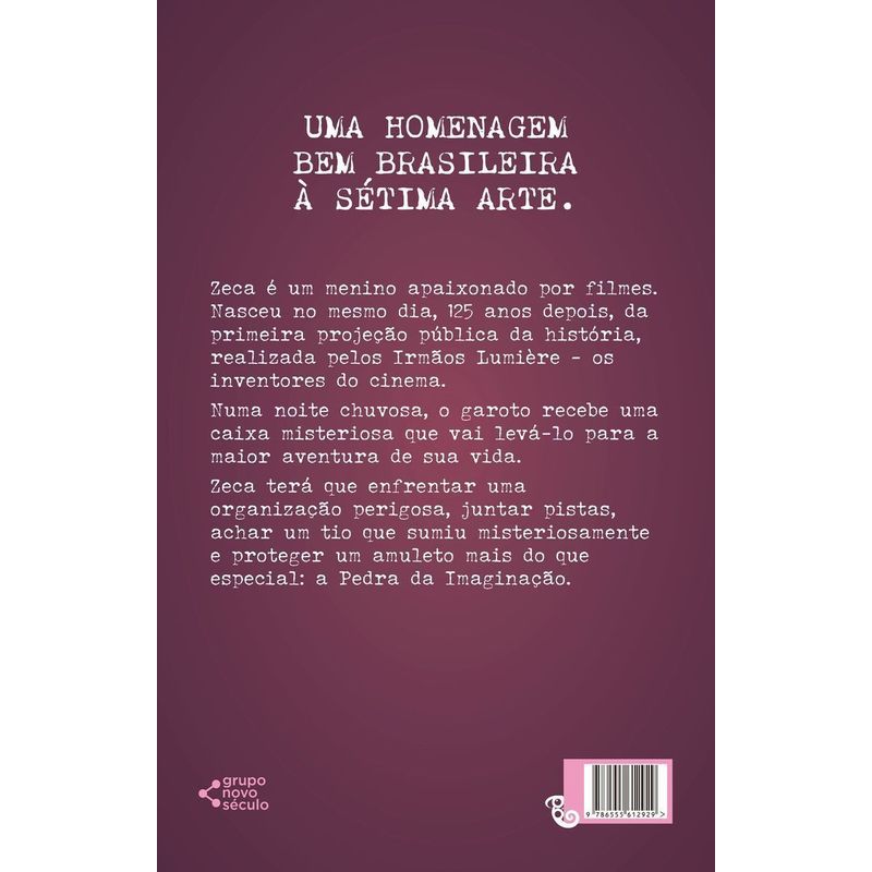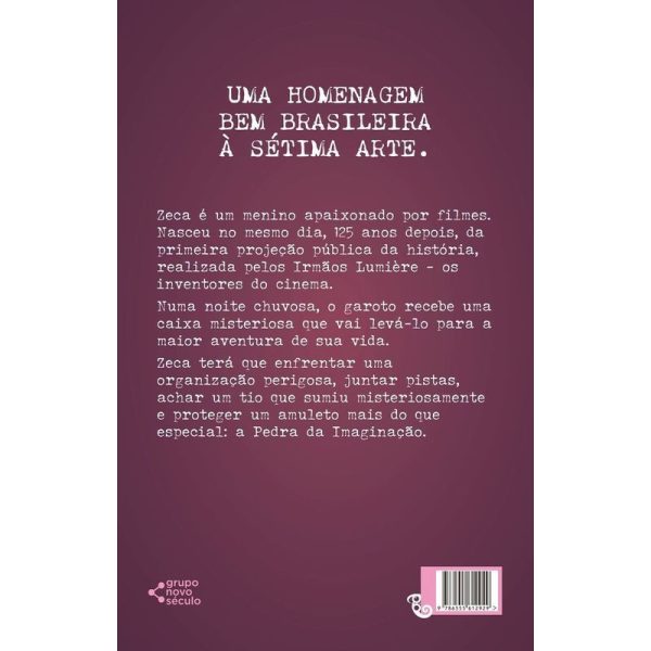 Zeca nasceu destinado a amar o cinema. Deu seu primeiro berro no dia 28 de dezembro de 2006. Cento e onze anos antes, no mesmo dia, os irmãos Lumière fizeram a primeira projeção pública da história, no primeiro cinema do mundo: O Éden. Neste dia importante, nascia o cinema e o pequeno Zeca. Não foi nenhum espanto para seus pais quando Zeca disse sua primeira palavra: CI NE MA. Claro que não podia ter sido outra, afinal, desde pequeno, ficava hipnotizado com os filmes de Chaplin e Buster Keaton. Zeca cresceu, virou um pré-adolescente e fez da sétima arte sua escola. Porém, um mistério não sai da cabeça do garoto: seu Tio Heitor, que assim como ele era um apaixonado por cinema, sumiu misteriosamente, há muitos anos, sem deixar absolutamente nenhum vestígio. Até que numa noite chuvosa, sozinho em sua casa, Zeca recebe uma caixa enigmática que vai levá-lo numa aventura até o verdadeiro paradeiro de seu tio, passando pelos primeiros filmes da história do cinema; pistas inesperadas dentro dos filmes dos irmãos Lumière; viagens; fugas perigosas; poderes fantásticos; atores, atrizes e diretores do passado; uma organização criminosa e um cobiçado amuleto que poderá salvar o mundo: a Pedra da Imaginação.